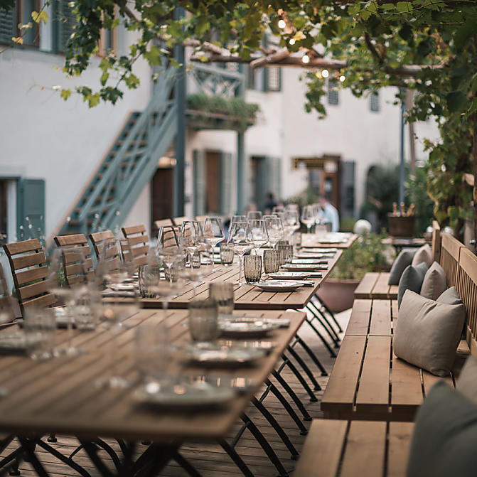 Un ristorante-bistrot serale, aperto dal mercoledì alla domenica a partire dalle 18:00, sotto il motto: “Wine & Dine”. Che si tratti di un buon bicchiere di vino dopo il lavoro, di qualche piccolo piatto raffinato da condividere o di una serata gourmet con menù e abbinamento di vini – l’offerta culinaria è stata ripensata e il menù di conseguenza rielaborato.